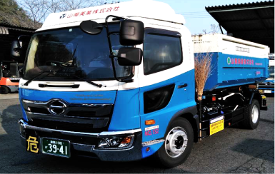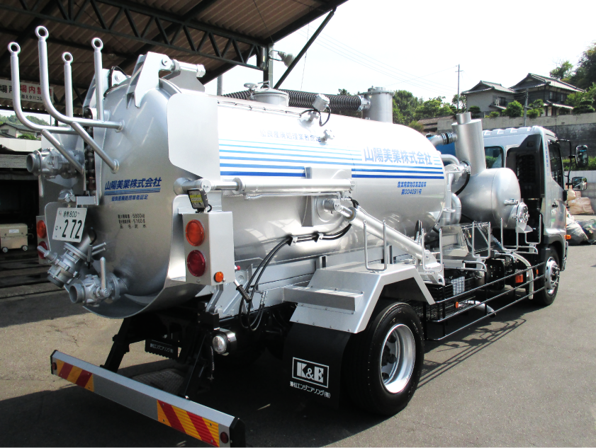 特殊車両として強力吸引車(風量40㎥)や低濃度PCB廃棄物専用タンクローリー車(3kL)を保有しています。強力吸引車は、工場内外のピット清掃、側溝清掃や液状の産業廃棄物の収集運搬に使用しています。