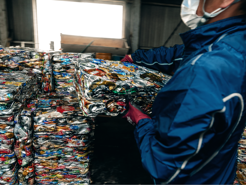 当社では玉島にリサイクル施設を設け、コンベア上で資源ごみの選別作業を行っています。ペットボトルや缶は重力や磁力を利用して自動的に分別され、効率的なリサイクルを実現しています。
