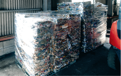 不燃ごみと資源ごみ、アルミ缶とスチール缶等は、風力および磁力選別機によって分別・プレスの工程を経て、再資源化または適正に埋立処理が行われます。