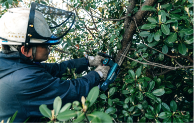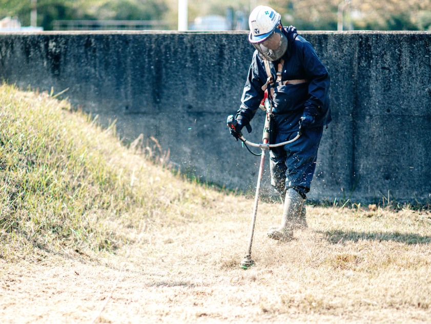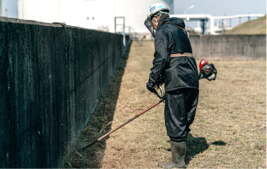 水島コンビナートの大手化学メーカー、鉄鋼メーカーにおいて、敷地内の緑化管理業務を行っています。草刈り、芝刈りから低木・高木剪定、芝張り、各種工事まで、お客様のご要望に応じられるようスキルアップを図っています。